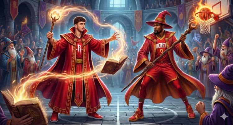 火箭球迷:我让Gemini给我生成一张杜兰特和申京化身巫师的图片 😂